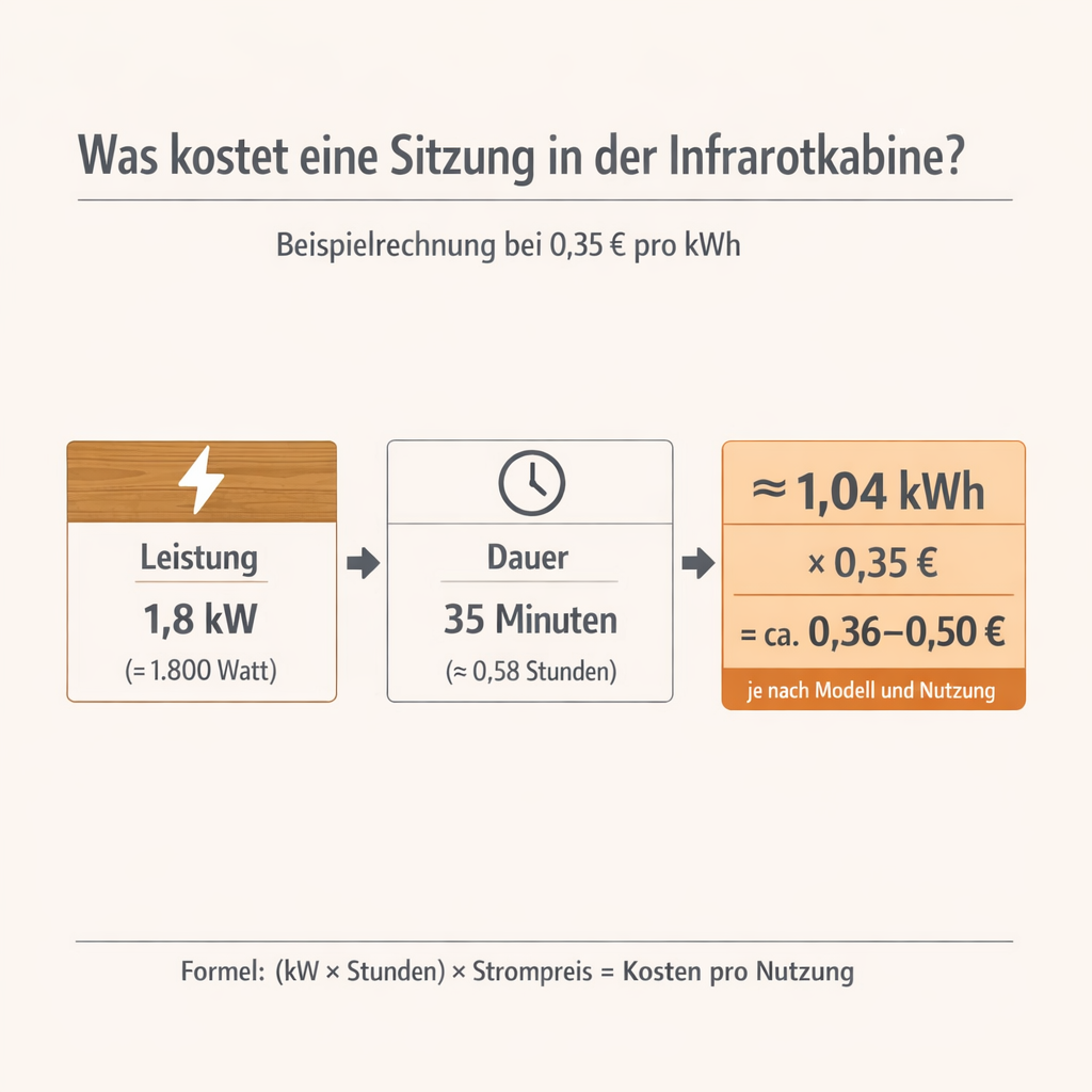 Armstark nennt für private Infrarotkabinen einen durchschnittlichen Verbrauch von 1,4–2,6 kW pro Stunde. Bei einer typischen Nutzung mit 1.800 W und 35 Minuten (inkl. Aufwärmphase) liegt der Verbrauch grob bei rund 1,1 kWh – das entspricht bei 0,35 €/kWh etwa 0,50 € pro Nutzung als gut verständlicher Orientierungswert.