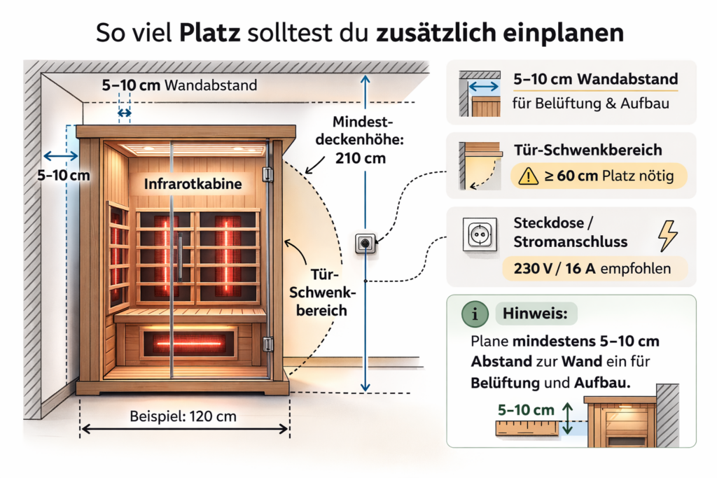 Infrarotkabinen sollten nicht direkt an alle Wände gepresst werden. Ein Abstand von etwa 2–5 cm zu mindestens einer Wand ermöglicht eine ausreichende Luftzirkulation und erleichtert Montage sowie Wartung.