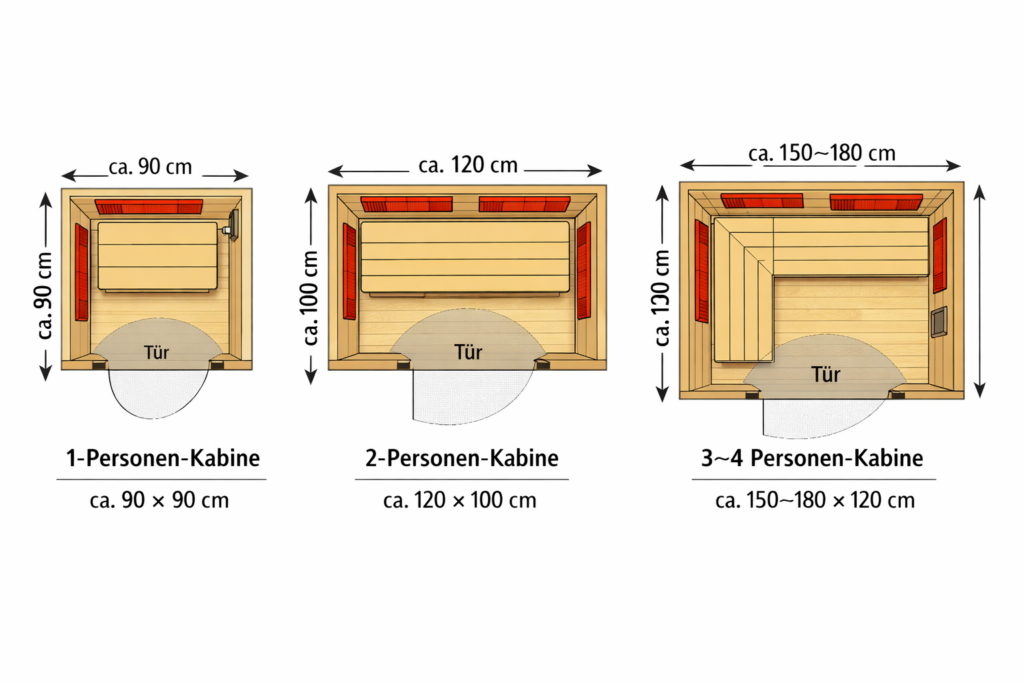 | 1 Person | ca. 90 × 90 cm | ~1 m² | kleine Wohnungen | Infrarotkabinen für 1 Person |